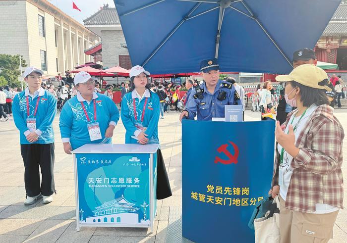当天清晨,我市志愿者按照统一部署,奔赴天安门广场指定岗位,化身“暖心向导”与“秩序守护者”。在重要路口与通道处,他们面带微笑,以清晰手势疏导人流车流、为观礼群众和游客指明方向;在指定区域内,他们来回巡视,提醒维护现场秩序,主动协助老人、儿童,妥善处理突发状况,全力保障广场核心区及周边游览、观礼活动有序进行。