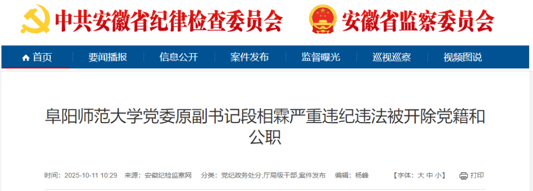 日前,经中共安徽省委批准,安徽省纪委监委对阜阳师范大学党委原副书记段相霖严重违纪违法问题进行了立案审查调查。