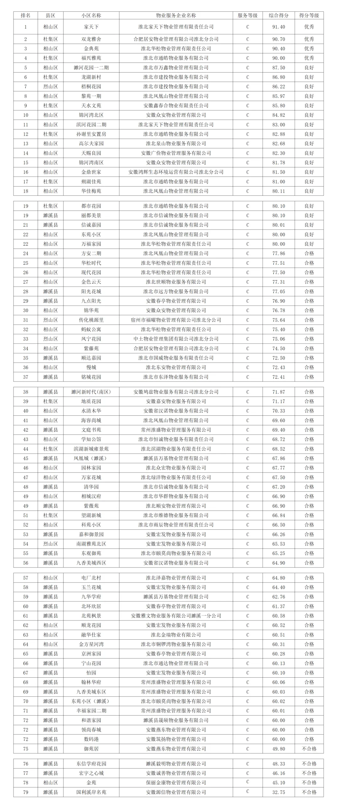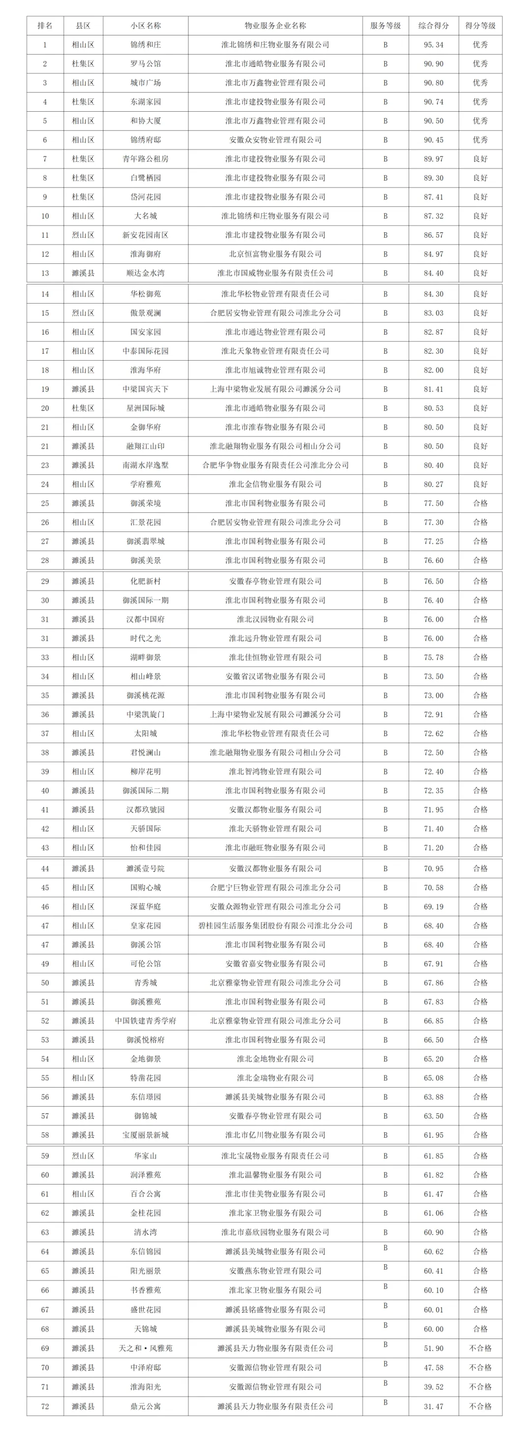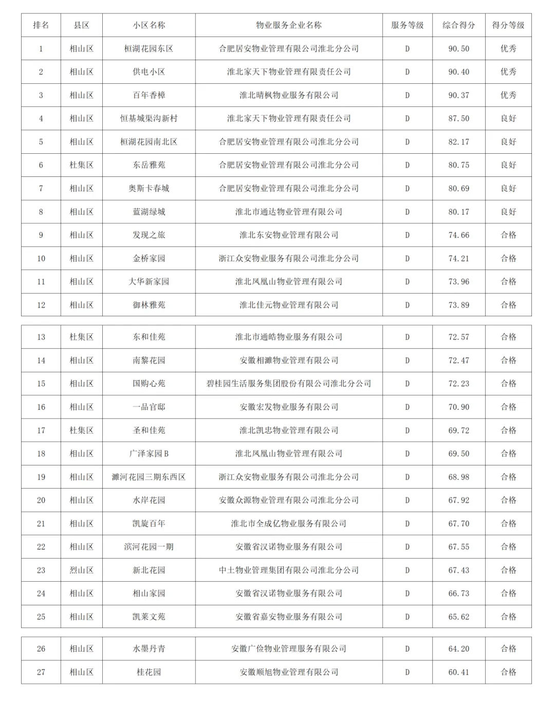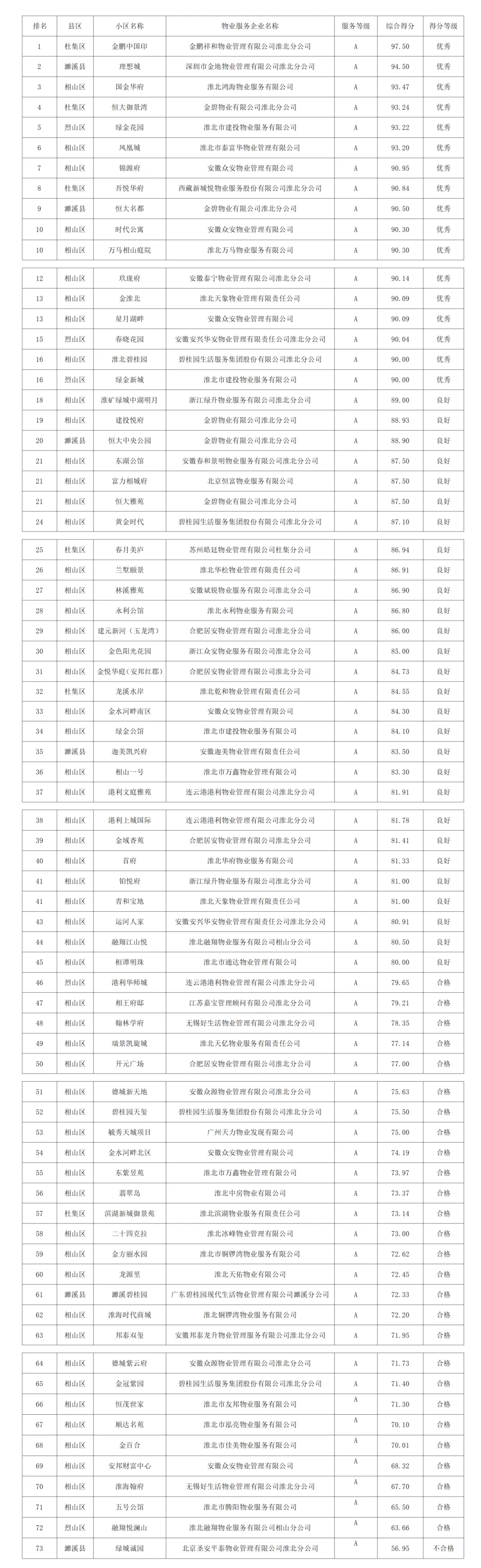 按照《安徽省物业管理条例》《淮北市住宅物业服务标准》《安徽省物业服务第三方评价技术标准》(DB34/T3959-2021)相关要求,淮北市房产管理服务中心委托第三方评估机构(淮北市物业服务行业协会)对全市物管小区开展2025年第三季度物业服务质量测评工作。测评结果按项目收费等级A、B、C、D四类分别按总得分降序排名,90分(含)以上为优秀,80分(含)-90分(不含)为良好,60分(含)-80分(不含)为合格,60分以下为不合格。本次共计测评251个小区,其中处于优秀水平的共计有30个,占12%,良好水平的共计有70个,占28%,合格水平的共计有141个,占56.1%,不合格的共计有10个,占3.9%。现将2025年第三季度物管小区物业服务质量测评结果数据予以发布。