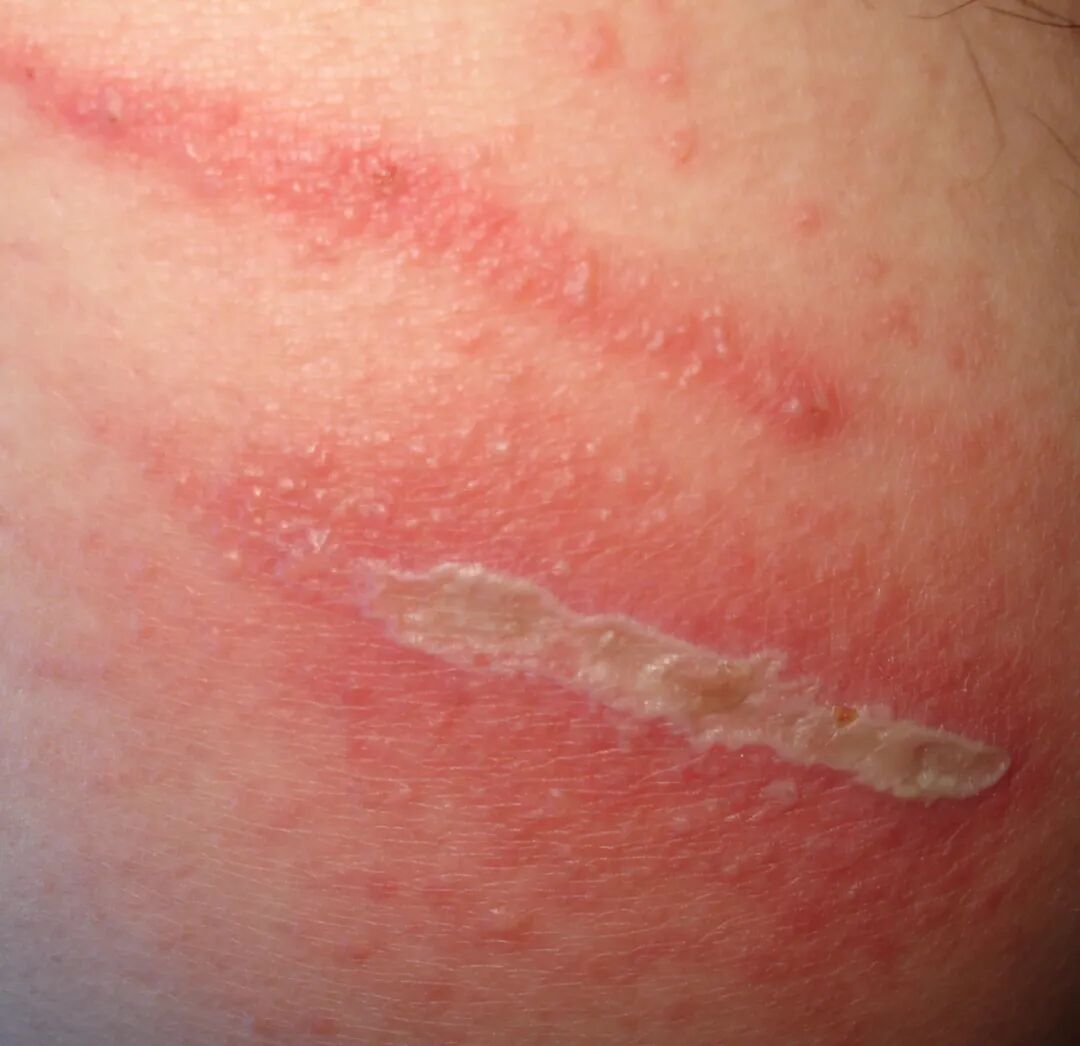 可出现线状、条片状或不规则红斑,表面出现细脓疱、糜烂、结痂情况,常有不同程度灼痛,部分伴有瘙痒感,严重者可出现发热、头晕等全身症状。