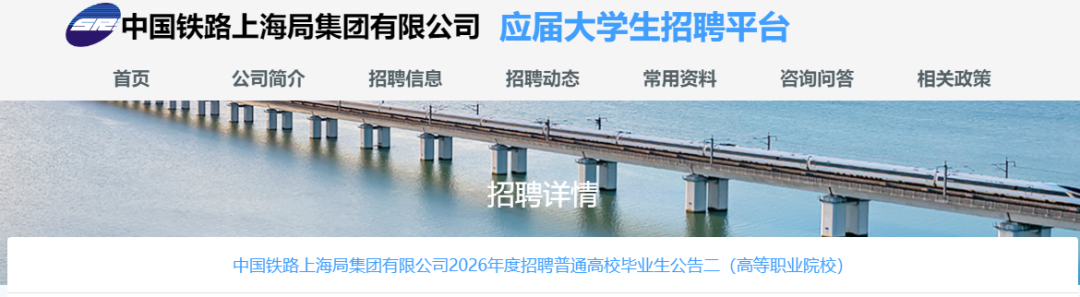 招聘流程按以下环节进行:网上报名、资格审查、考试考核、公示录用等。中国铁路上海局集团有限公司将根据招聘岗位需求分期分批审核筛选毕业生参加考试考核,具体时间、地点及方式另行通知。未进入考试考核以及后续环节的毕业生恕不通知。
