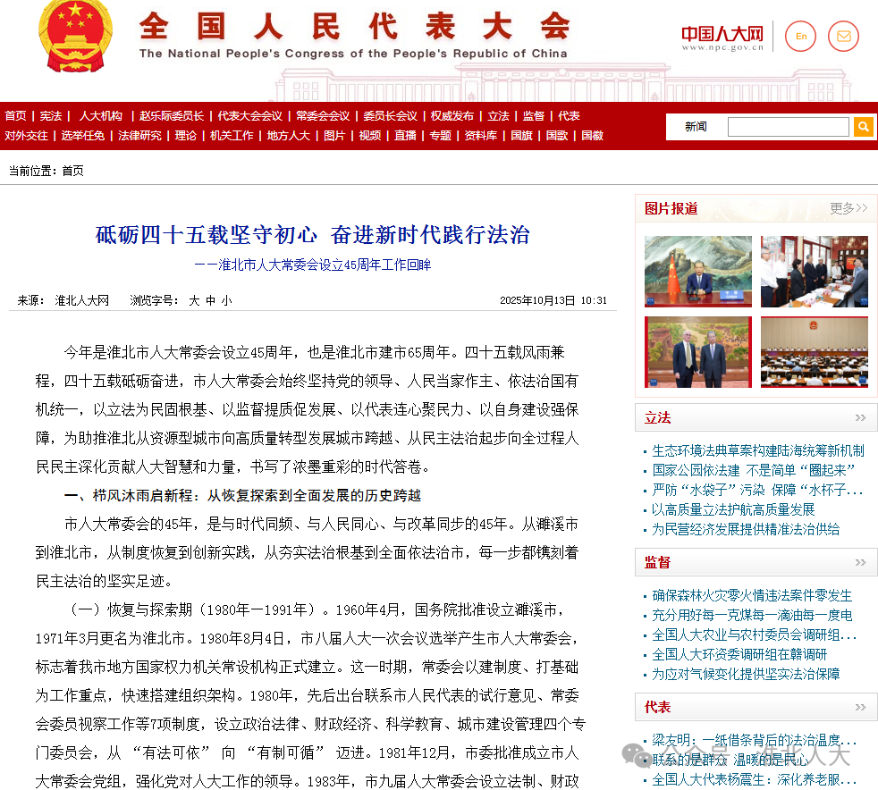10月13日,全国人大官网以《砥砺四十五载坚守初心奋进新时代践行法治》为题,报道了淮北市人大常委会设立45周年工作回眸。全文如下: