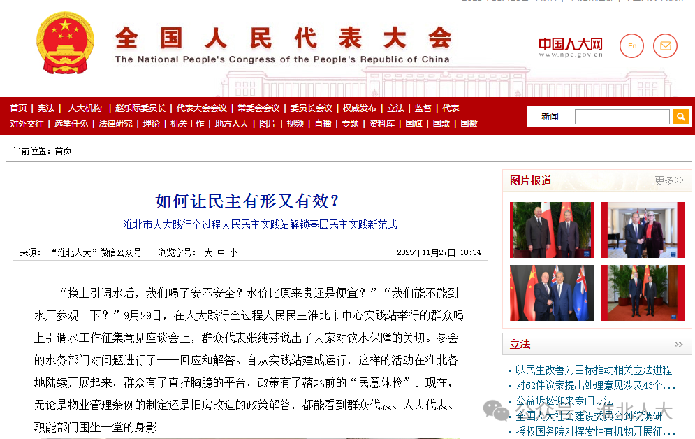11月27日,全国人大官网以《淮北:如何让民主有形又有效?——淮北市人大践行全过程人民民主实践站解锁基层民主实践新范式》为题,报道了淮北市人大常委会以建设实践站为抓手,深耕全过程人民民主实践沃土,绘就民意畅通、民力汇聚、民生改善的生动画卷。全文如下: