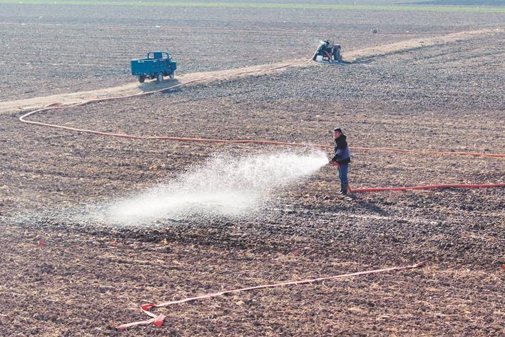 11月29日,濉溪县四铺镇洪南村村民利用水管喷灌技术给越冬小麦浇灌“蒙头水”。
