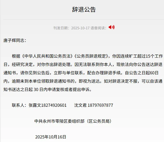 据湖南《永州日报》消息,中共永州市零陵区委组织部(区公务员局)10月16日发布《辞退公告》,全文如下。