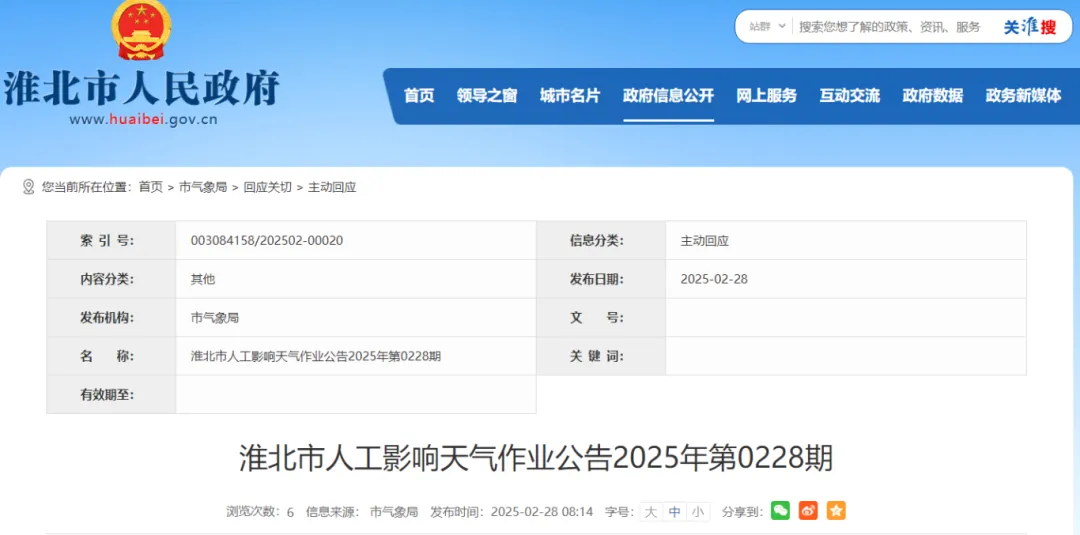 淮北市人工影响天气办公室将于2025年2月28-3月3日在淮北市境内实施人工增雨作业,采用装备为增雨火箭、增雨烟炉。